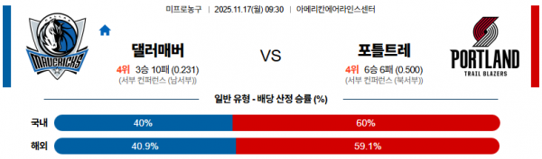 포틀랜드는 최근 기복이 있지만 젊은 자원들의 에너지를 앞세워 반등의 기회를 잡고 있다. 아브디야와 샤프가 안정적인 득점 루트를 만들며 팀 공격의 중심을 잡고 있고, 리바운드에서도 점차 경쟁력을 회복 중이다. 턴오버 관리만 개선된다면 충분히 주도권을 잡을 수 있는 전력이다. 반면 댈러스는 주전들의 부상 여파로 전력이 크게 약화됐고, 최근 경기에서도 연속된 턴오버와 수비 집중력 저하로 흐름을 잃고 있다. 또한, 다음날 원정에서 미네소타를 만나는 일정을 위해서 힘을 분산해야 하는 댈러스가 된다.