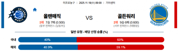 올랜도는 핵심 선수들의 결장 여파 속에서도 홈 이점을 앞세워 초반 리드를 노리겠지만, 파올로 반케로와 제일런 석스의 부상이 이어지는 점이 변수다. 프란츠 바그너의 공격력과 데스몬드 베인의 외곽 지원이 필요하나 연장전에서 드러난 수비 집중력 저하가 불안 요소다. 반면 ,다음날 원정에서 마이애미를 만나는 일정을 위해서 힘을 분산해야 하는 골든스테이트최근 3연승과 외곽 3점슛 24개를 성공시키며 확실한 공격 밸런스를 되찾았다. 모지스 무디의 상승세와 드레이먼드 그린의 리바운드 가담이 안정적이며, 원정 연승 흐름도 이어지고 있다.