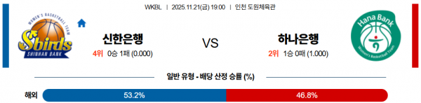 하나은행은 개막전에서 높이 우위를 기반으로 리바운드와 외곽 득점이 모두 살아나며 우리은행을 크게 제압했고 전체적인 에너지 레벨에서도 상대를 압도했다. 반면 신한은행은 주축 선수들의 몸상태가 완전하지 않고 미마 루이의 부상 결장까지 겹치며 전력 손실이 뚜렷하다. 이상범 감독 체제에서 정규리그 데뷔전에서 우리은행을 완파한 하나은행의 기세가 이어질 것이다.
