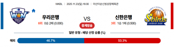 우리은행은 연속경기 일정이다. 우리은행은 직전경기(11/22) 홈에서 삼성생명 상대로 44-63 패배를 기록했으며 개막전 이였던 이전경기 원정에서 하나은행 상대로 45-66 패배를 기록했다. 2연패 흐름 속에 리바운드(48-47), 3점슛(4-5), 범실(6-11)의 결과. 가드 부재가 확실하게 드러나며흐름을 빼앗겼고 외곽슛까지 연달아 빗나가 공격 리듬이 완전히 끊겼던 경기. 상대의 강한 수비와 빠른 트랜지션에 고전하는 가운데 세컨찬스에서도 열세가 이어져 격차를 좁히지 못했던 상황. 감단비(14득점, 15리바운드)가 분전했지만 높이와 활동량에서의 열세, 외곽 난조, 수비 로테이션 문제가 겹치며 경기 흐름을 되찾지 못하고 완패를 당했다.