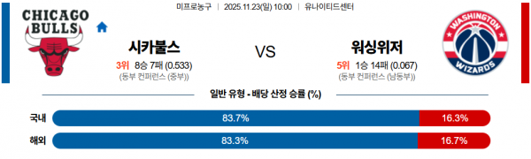 시카고는 직전 경기에서 대패를 겪었지만 아요 도순무와 조쉬 기디를 중심으로 한 기본 전력은 여전히 우위에 있다. 특히 홈 5승2패의 안정감과 워싱턴 상대 최근 2연승 흐름이 긍정적으로 작용한다. 반면, 워싱턴은 13연패에 수비 조직력 붕괴가 심각하며 원정 1승8패로 경쟁력이 거의 없다. 3점 성공률과 리바운드 열세가 반복되고 있어 흐름 반전 가능성이 낮다.