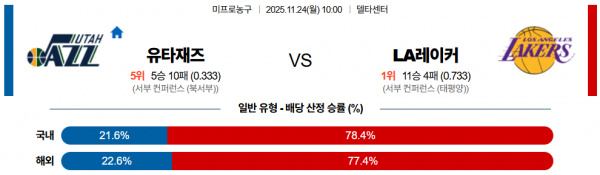 유타는 직전경기(11/22) 홈에서 오클라호마 상대로 112-144 패배를 기록했으며 이전경기(11/19) 원정에서 LA 레이커스 상대로 126-140 패배를 기록했다. 2연패 흐름 속에 리바운드 39-26, 3점슛 16-23, 턴오버 27-13의 결과. 키온테 조지가 20득점, 라우리 마카넨이 19득점으로 공격을 이끌며 1쿼터 44득점을 기록하는 좋은 흐름을 만들었으며 전반전까지 리드를 유지했으나 3쿼터(20-43)에만 턴오버 9개를 범하며 경기 흐름이 무너졌던 경기. 상대의 강한 압박 속에 22실점 연속 허용을 포함해 33대4 런을 허용했고 수비와 볼 처리 모두 흔들렸다. 정규시즌 홈경기에서는 4승4패 성적.