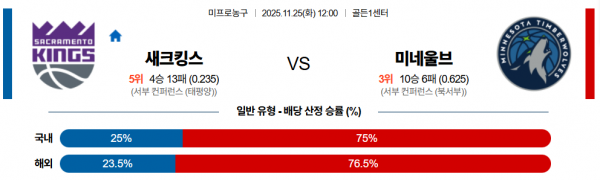 미네소타는 최근 피닉스전에서 아쉽게 패했지만 에드워즈가 41득점으로 절정의 득점력을 보여주며 팀 공격을 완전히 이끌었다. 턴오버 관리가 아쉬웠지만 원정에서 5승3패로 안정적인 흐름을 유지 중이다. 반면 새크라멘토는 8연패를 끊었으나 사보니스의 이탈 공백이 크고 홈에서도 2승5패로 분위기가 좋지 않다. 웨스트브룩과 슈뢰더의 활약이 있었지만 전력 전체의 안정감은 떨어지는 모습이다.