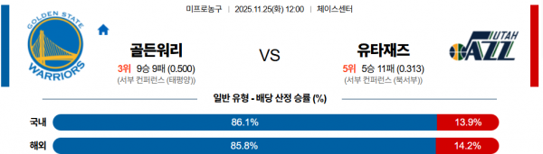 유타는 3연패에 이어 원정 1승6패로 극심한 부진이 이어지고 있고 수비 기복과 4쿼터 해결력 부족이 반복되고 있다. 마카넨이 분전해도 팀 전체의 효율이 떨어지는 점도 문제다. 반면, 골든스테이트는 최근 3연패지만 홈에서는 5승1패로 확실한 강세를 이어가고 있고 커리가 여전히 강력한 파괴력을 보여주고 있다. 골든스테이트 승리가 예상되는 경기. 다만, 핸디캡 범위는 과하다고 생각된다.