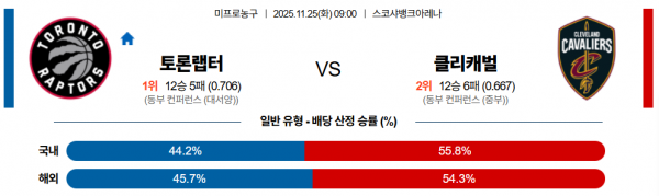 클리블랜드는 최근 5경기 4승1패로 뚜렷한 상승세를 이어가고 있다. 도노반 미첼이팀 공격을 확실히 주도했고 모블리도 꾸준한 더블더블 흐름을 유지하며 골밑에서 우위를 만들고 있다. 토론토와 일전을 위해서 재럿 앨런(C)과 론조 볼(G)이 휴식을 취한 효과도 기대가 되며 갈란드의 복귀 효과도 눈에 띄며 로테이션 안정감이 한층 좋아졌다. 반면, 토론토는 7연승으로 흐름은 좋지만 RJ 배릿이 무릎을 접질리며 이탈한 점이 치명적 변수다. 반스와 월터가 분전하고 있으나 전력 누수는 피하기 어렵다