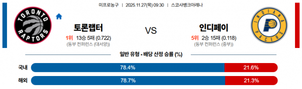 토론토는 홈 6연승과 함께 8연승 흐름을 이어가며 공수 밸런스가 완전히 올라온 상태다. 잉그램의 폭발적인 득점력과 반즈의 안정적인 더블더블, 퍼틀의 골밑 수비가 견고하게 유지되고 있어 인디애나의 빈약해진 전력을 상대로 주도권을 잡을 가능성이 높다. 반면, 인디애나는 핵심 전력 다수가 부상으로 이탈해 전력 공백이 심각하고 원정 9연패 흐름 속에 리바운드와 수비 집중력 모두 불안정하다.
