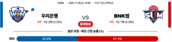 우리은행은 직전 경기에서 신한은행을 크게 잡으며 분위기 전환에 성공했지만, 여전히 득점 편중과 외곽 기복이 뚜렷해 안정감이 떨어진다. 김단비 중심 전술이 강하게 드러나 상대의 집중 견제를 받을 가능성도 높다. 반면, BNK 썸은 KB스타즈전 패배에도 불구하고 안혜지, 박혜진, 이소희의 백코트 조합이 꾸준한 생산력을 유지하고 있으며, 개막전에서 보여준 조직적인 수비와 리바운드 참여가 인상적이었다. 우리은행의 가드 부재가 확실하게 드러나며 흐름을 빼앗길 위험성이 높은 상대가 BNK 썸 이라고 생각된다.