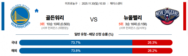 골든스테이트 승리가 예상된다. 다만, 커리의 이탈은 핸디캡 승부에서 뉴올리언즈에게 큰 기회를 부여한다.