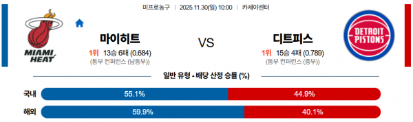 마이애미는 홈 9승1패 흐름에 6연승까지 이어가며 안정적인 수비 조직력과 경기 후반 집중력이 돋보인다. 히로와 아데바요의 조합도 상승세가 뚜렷하다. 반면, 디트로이트는 연이은 원정과 2연패로 체력 소모가 확실하고 턴오버 증가로 득점 흐름이 자주 끊기고 있다. 두 팀의 최근 흐름을 고려하면 마이애미가 주도권을 잡을 가능성이 높고 수비 경기 양상으로 접어들 전망이다.