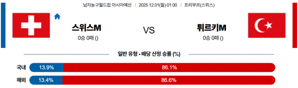 튀르키예 승리가 예상되는 경기. 다만, 핸디캡 승부에서는 스위스의 손을 들어줄수 있다. 첫 경기 패배는 아쉽지만 강호 세르비아를 상대로 뛰어난 전반 내용을 보여주며 경쟁력은 충분히 입증한 스위스 였다.