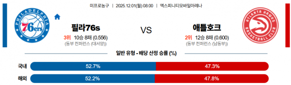 다음날 원정에서 디트로이트 를 만나는 일정을 위해서 힘을 분산해야 하는 애틀란타는 최근 4경기 3승1패로 흐름이 좋고, 트레이 영 부재 속에서도 제일런 존슨의 트리플더블 활약과 알렉산더 워커의 결정력으로 후반 경기 운영이 안정적이다. 원정에서도 8승4패로 강한 모습을 유지하고 있다. 반면 필라델피아는 엠비드와 폴 조지 등 핵심 전력의 연속 이탈에 더해 드러먼드까지 부상 변수로 전력 공백이 커졌고 홈에서 3연패로 기세가 꺾였다.