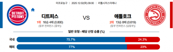 디트로이트는 백투백 원정이였던 직전경기(11/30) 원정에서 마이애미 상대로 138-135 승리를 기록했으며 이전경기(11/29) 홈에서 올랜도 상대로 109-112 패배를 기록했다. 2연패에서 벗어나는 승리가 나왔으며 리바운드 43-38, 3점슛 11-14, 턴오버 21-17의 결과. 케이드 커닝햄이 29득점을 기록하며 공격을 이끌었고, 던컨 로빈슨은 마이애미 원정 복귀전에서 18득점을 올리며 존재감을 보였던 경기.. 토바이어스 해리스는 10개의 야투를 포함해 26득점으로 높은 효율을 보였고, 인사이드 득점이 76점에 달할 만큼 페인트존 장악력이 돋보였다. 또한, 접전 상황에서도 집중력과 수비 조직력이 돋보였던 승리였다. 정규시즌 홈경기에서는 8승2패 성적.