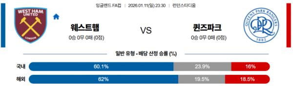 2026-01-11 23:30 잉글랜드 FA컵 웨스트햄 퀸즈 파크 레인저스
