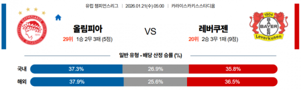 2026-01-21 05:00 UEFA 챔피언스리그 올림피아코스 레버쿠젠