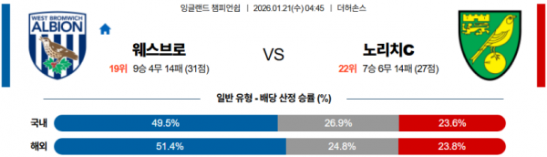 2026-01-21 04:45 잉글랜드 챔피언쉽 웨스트 브로미치 앨비언 노리치 시티 FC