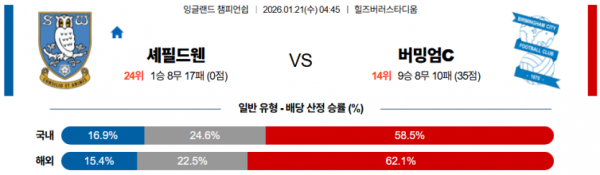 2026-01-21 04:45 잉글랜드 챔피언쉽 셰필드 웬즈데이 버밍엄시티