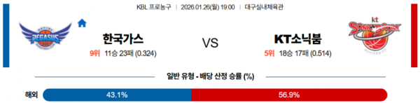 2026-01-26 19:00 KBL 대구 한국가스공사 수원 KT