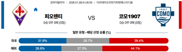 이번 경기는 점유율 싸움이 아니라 효율 싸움에 가깝기 때문에, 전술 상성과 동기부여를 모두 고려하면 코모가 피오렌티나의 빈틈을 찌르며 이변이 아닌 설계된 승리를 만들어낼 가능성이 충분한 매치업이다.