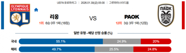 2026-01-30 05:00 UEFA 유로파리그 올랭피크 리옹 PAOK