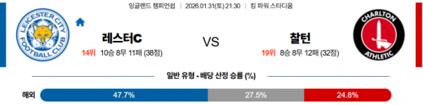 2026-01-31 21:30 잉글랜드 챔피언쉽 레스터 시티 찰튼