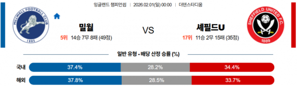 2026-02-01 00:00 잉글랜드 챔피언쉽 밀월 FC 셰필드 유나이티드
