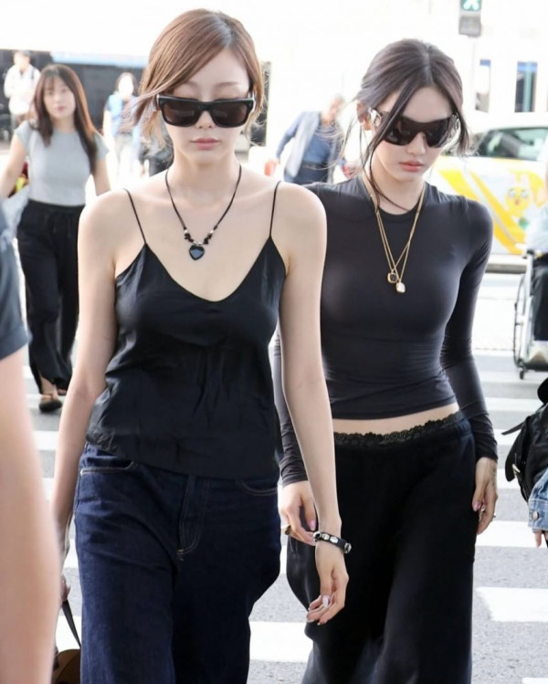 선글라스 끼고 출국하는 에스파 닝닝 지젤 브라 비치는 짙은 회색티