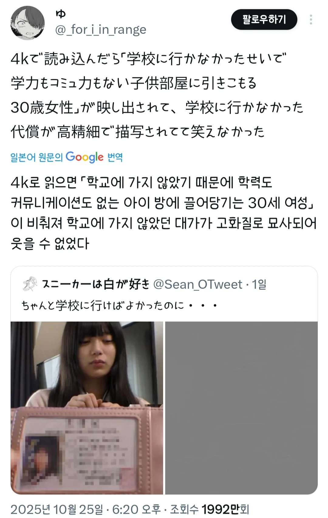 - '4K로 봤더니 학교에 가지 않아서 학력도 없이 30이 되도록 부모님 집 작은방에 틀어박힌 여자'가 나와 학교에 가지 않은 대가가 고화질로 묘사되어 웃지 못했습니다