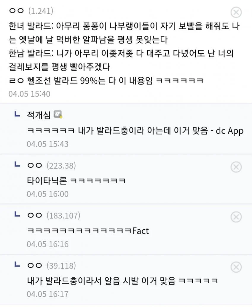 디시인이 생각하는 한국 발라드 가사 특징